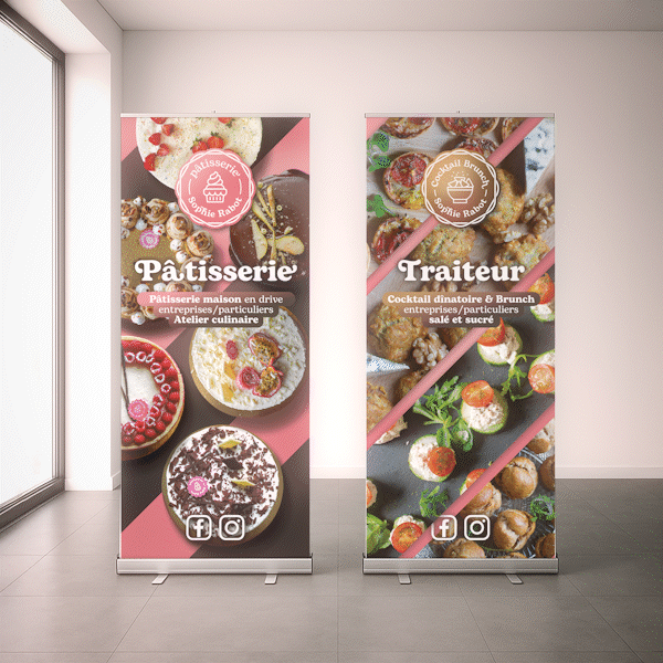 Au-delà du logo, nous avons décliné l’identité de Sophie Rabot Pâtisserie sur l’ensemble de ses supports imprimés et signalétiques : papeterie, étiquettes sur gâteaux, cartes desserts & flyers, cartes cadeaux, Kakémonos, enseigne et PLV.